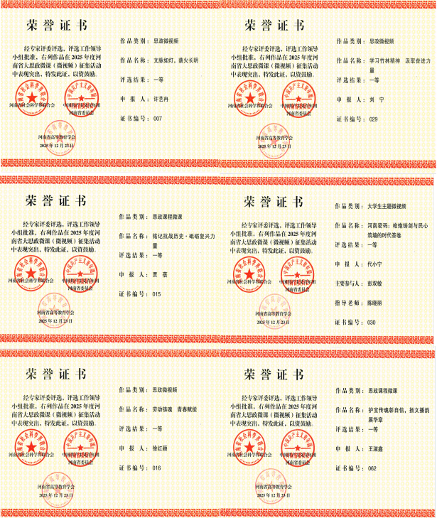 根据《关于公布2025年度河南省大思政微课(微视频)征集活动评选结果的通知》(豫社科联字〔2025〕22号),我校在本次活动中表现出色,共有18部作品脱颖而出荣获奖项,其中一等奖6部、二等奖4部、三等奖8部。自申报工作启动以来,科研处与各教学单位紧密联动,严格按照河南省社科联的限额申报要求,坚持“质量为先、优中选优”的原则,围绕“内容深度、教学设计、镜头语言、育人感染力”四大维度开展多轮次、一对一打磨,最终在提交的60余部作品中推荐上报10部思政课程微课视频、10部课程思政微课视频、10部思政微视频以及10部大学生主题微视频,确保了18部作品成功获奖。近年来,我校持续纵深推进“学术郑商”建设,