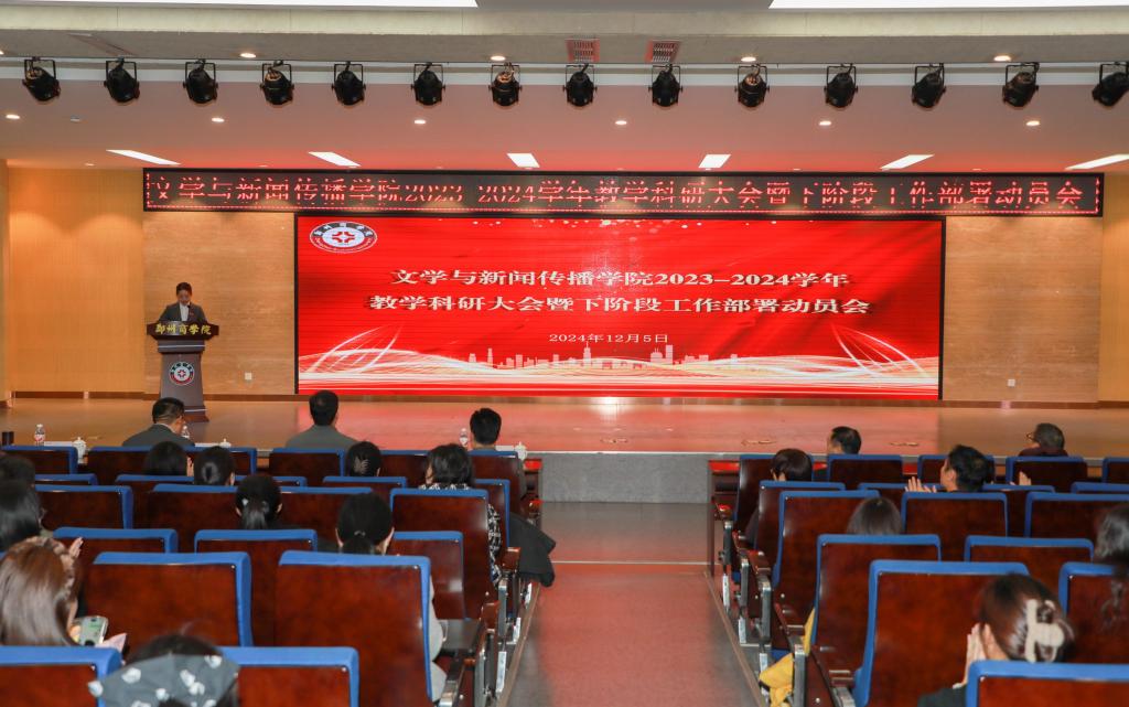 为全面总结上学年教学科研成果,明确下阶段工作目标与方向,表彰教学、考研辅导先进师生,12月5日,文学与新闻传播学院在自力楼报告厅举行了2023-2024学年教学科研大会暨下阶段工作部署动员会。我校董事长助理陈宗纬、教学质量评估中心主任张晓辉、科研处处长刘志飞,文传学院院长王松、党委书记贾蓓、副院长石璐、学院全体教职员工出席会议。