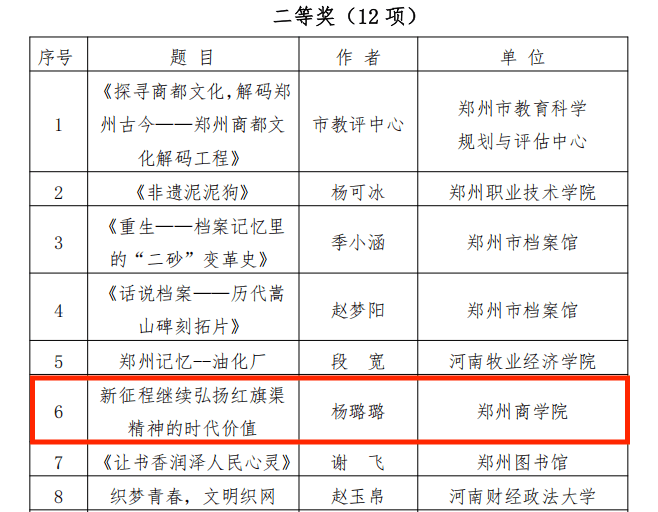 近日,由中共郑州市委宣传部、郑州市社会科学界联合会、郑州市文广旅局、郑州图书馆联合举办的郑州市2025年社会科学普及周开幕式在郑州图书馆举行。我校教师杨璐璐、江琳琳的作品《新征程继续弘扬红旗渠精神的时代价值》和《新时代如何坚持和发展实事求是思想路线》在2025年郑州市社科普及“微视频”征集评比活动中,分别荣获二等奖和三等奖。