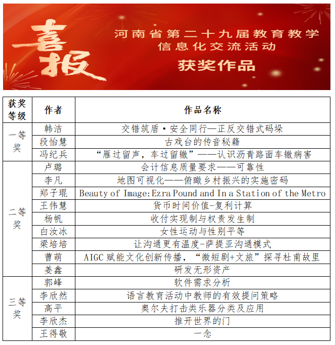 根据《河南省教育厅办公室关于举办河南省第二十九届教育教学信息化交流活动的通知》(教资保函〔2025〕259号)要求,经各单位申报,专家评审,我校17项优秀教学作品获奖,其中韩洁、段怡慧、冯纪兵三名老师的微课作品荣获一等奖,卢璐、李凡、郑子琨、王伟慧、杨帆、白汝冰、梁培培、曹萌、姜鑫九名老师的微课作品荣获二等奖,郭峰、李欣然、高平三名老师的微课作品荣获三等奖,李欣杰、王得敬二名老师的优秀教育电视节目荣获三等奖。