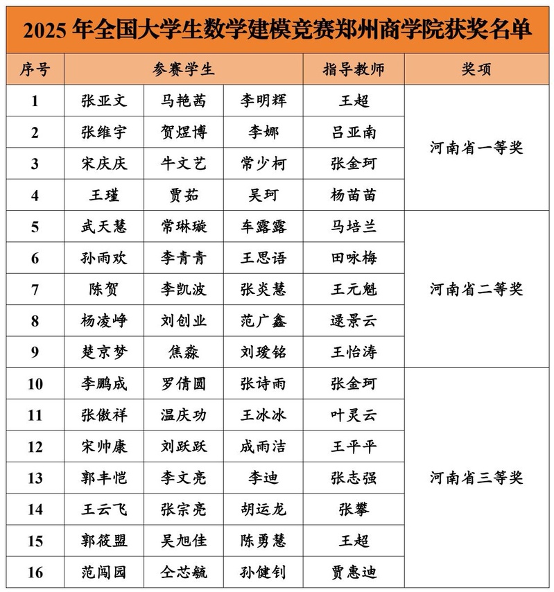 2025年全国大学生数学建模竞赛河南赛区获奖名单于近日公布,我校参赛学生在该项竞赛中再一次创造了优异的成绩,共有16个参赛队获奖,其中省级一等奖4项、二等奖5项、三等奖7项。