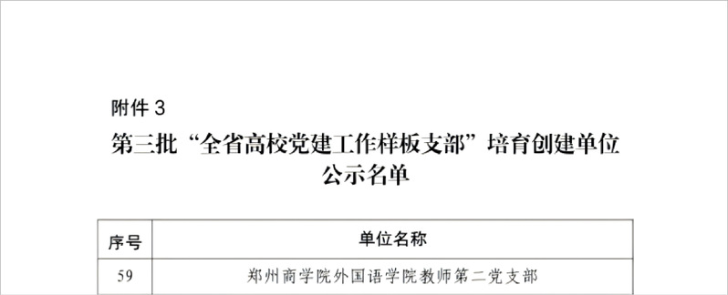 近日,河南省教育厅对全省教育系统党建强基引领“三级联创”及第三批全省高校“双带头人”教师党支部书记工作室的评选结果进行了公示,我校外国语学院教师第二党支部以扎实的党建工作基础、突出的育人成效及鲜明的特色优势,获评第三批“全省高校党建工作样板支部”培育创建单位,这是我校党建工作取得的又一个标志性成果。