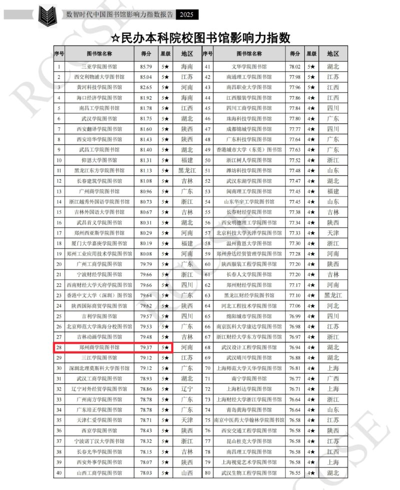 近日,武汉大学中国科学评价研究中心与数字出版智能服务技术教育部工程研究中心联合发布了《数智时代中国图书馆影响力指数报告(2025版)》。报告显示,我校图书馆在“民办本科院校图书馆影响力指数”排名中,位居全国第28名,位列河南省民办本科院校第4名,并荣获最高等级的“5★图书馆”称号。