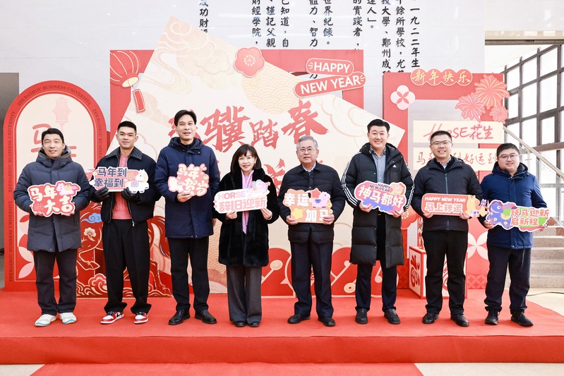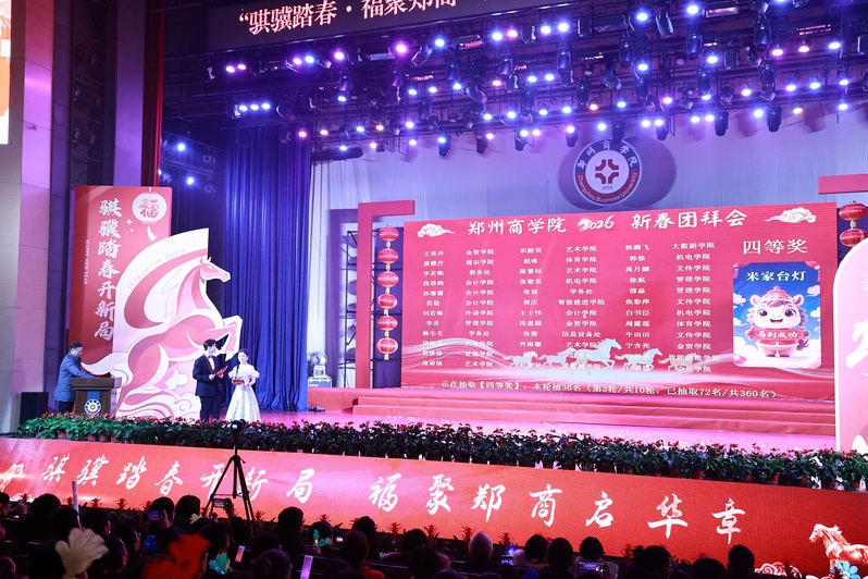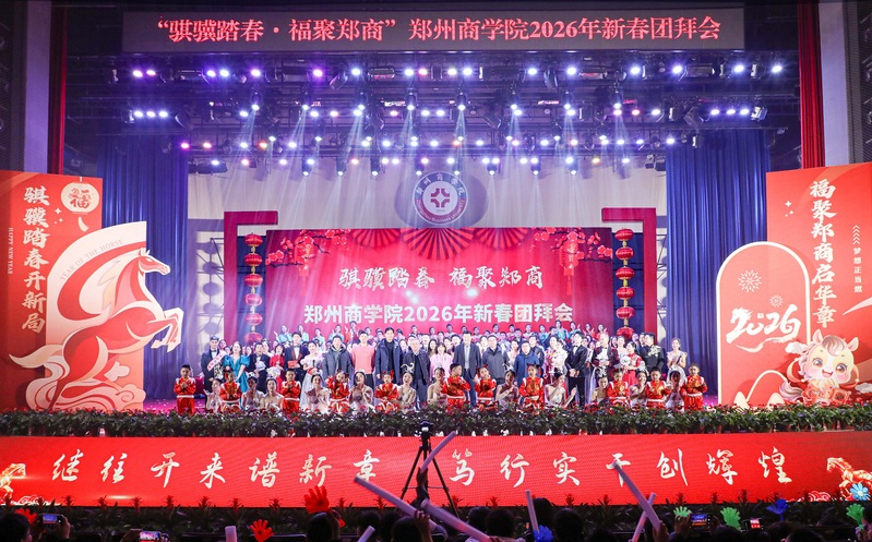 骐骥踏春开新篇,福聚郑商贺新岁。1月20日下午,我校在成功大会堂举行“骐骥踏春·福聚郑商”2026年新春团拜会。董事长王育华、执行董事陈坚德、党委书记吴建军、校长吴泽强、董事长助理陈宗纬、党委副书记兼纪委书记裴晓涛、副校长刘升阳、校长助理兼工会主席泥川及各单位主管、副主管、全校教职员工、友好企业代表欢聚一堂,共庆新春佳节,现场洋溢着喜庆祥和的气氛。