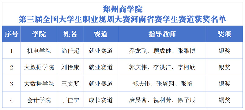 1月28日,第三届全国大学生职业规划大赛河南省赛颁奖仪式在洛阳师范学院举办。我校在本届大赛中斩获优秀组织奖,教师赛道荣获银奖,学生赛道摘得3银1铜,充分彰显了郑商生涯教育与就业指导课程建设的扎实积淀和育人成效。