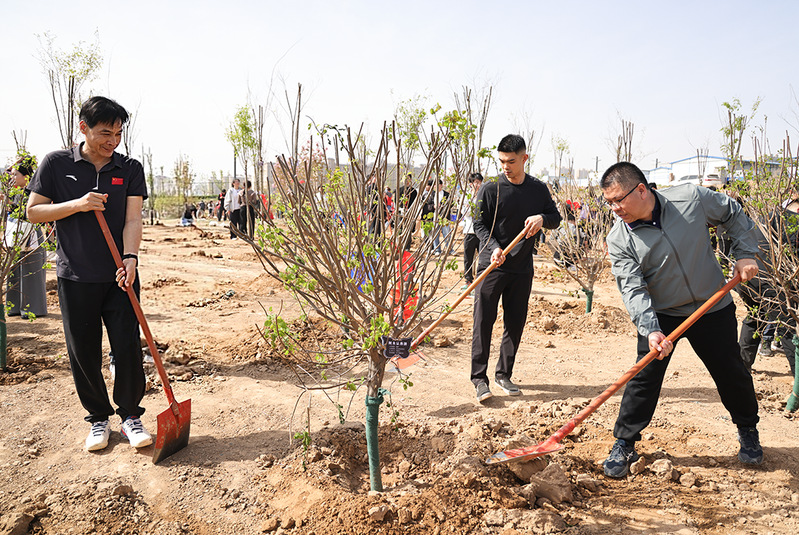 携手添新绿,心系母校情。4月6日上午,我校2026届毕业生植树活动在三彩校区开展。校党委书记吴建军、董事长助理陈宗纬、校党委副书记兼纪委书记裴晓涛和相关部门主管以及各学院党委书记与2026届毕业生代表共同参与植树活动。