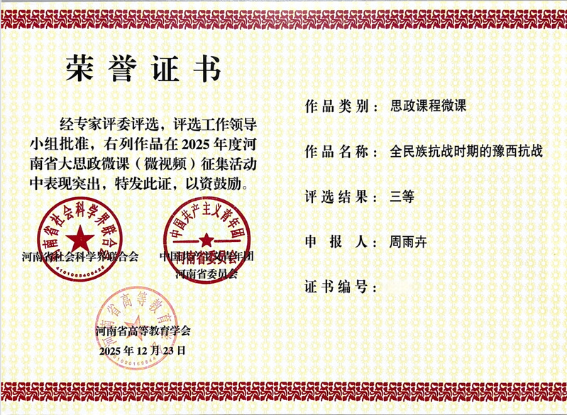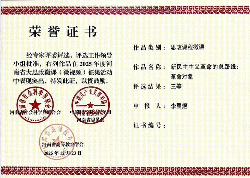 近日,河南省社会科学界联合会、中国共产主义青年团河南省委员会、河南省高等教育学会联合发布《关于公布2025年度河南省大思政微课(微视频)征集活动评选结果的通知》(豫社科联字〔2025〕10号),我校教师王淑鑫、周雨卉和李星煜表现突出,分别获得一等奖和三等奖。