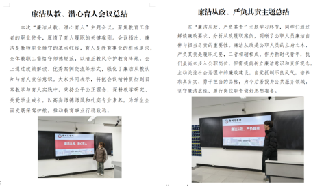 按照“分层分类”原则,组织开展了针对性强的座谈研讨。党员干部围绕“廉洁从政、严负其责”深入交流;教师群体聚焦“廉洁从教、潜心育人”分享心得;学生层面则以“廉洁修身、诚信立身”为主题,通过班会、团日活动等形式展开广泛讨论。所有研讨均按要求提交了活动图片及200字以上的文字总结,确保了交流的深度与实效。