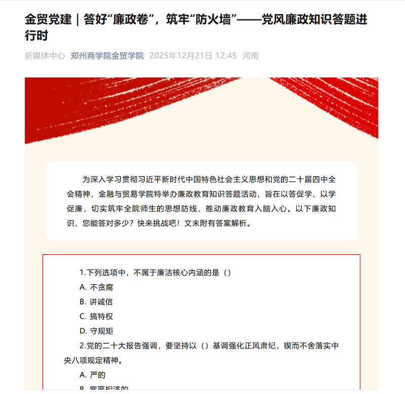 为深入贯彻落实全面从严治党要求,筑牢师生廉洁思想防线,营造风清气正的校园氛围,根据学校党委统一部署,金贸学院于2025年12月集中组织开展了以“清风铸魂守初心 廉洁笃行育新人”为主题的廉政警示教育系列活动。本次工作精心组织,扎实推进,取得了预期成效。现将主要情况总结如下: