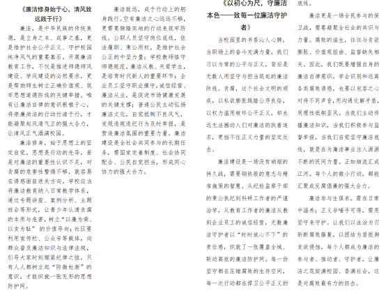以“书写”促“思悟”,我院成功举办了以“清风校园・廉洁有我”为主题的廉洁教育征文活动。 通过评选、展示、表彰优秀作品,树立了积极导向。同学们以笔为媒,将廉洁理念融入文字创作,用丰富的视角与真挚的情感,诠释着对廉洁的深刻理解。此次活动将廉洁理念融入日常学习生活、扎根师生心中,进一步推进了清廉校园建设。