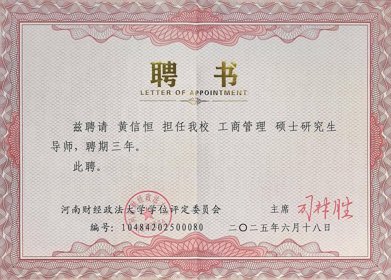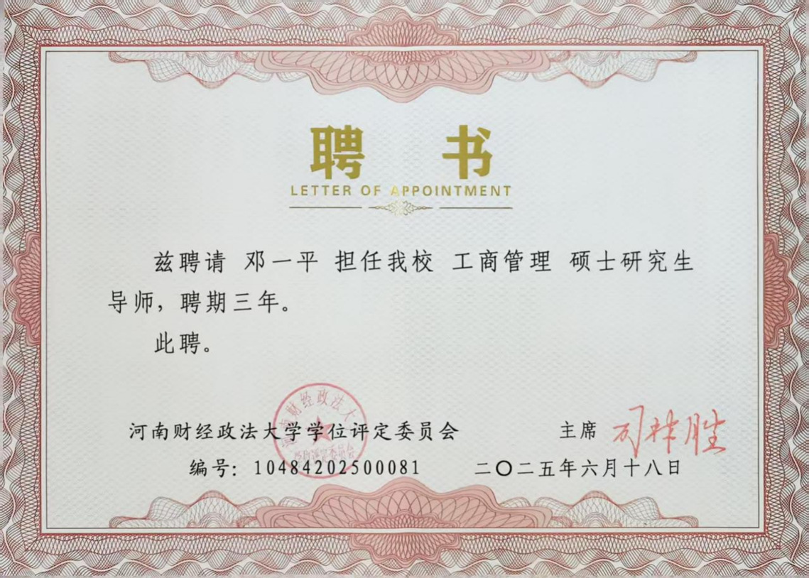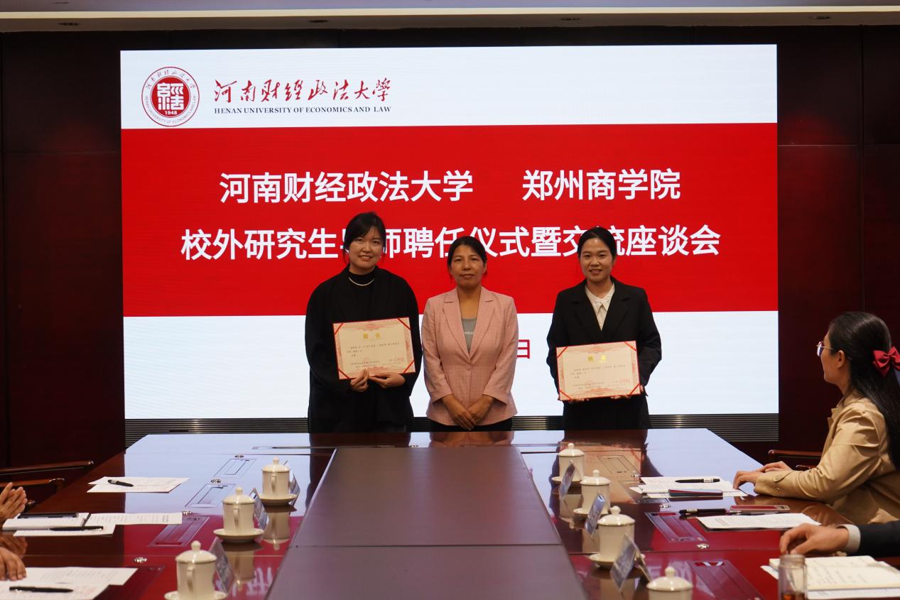 在导师聘任环节,蔺全丽副处长代表河南财经政法大学向郑州商学院管理学院教师邓一平、黄信恒颁发硕士研究生导师聘书,将加入管理学部王永伟部长与研究生处杨凯瑞副处长团队,深度参与学术规划、论文指导等关键具体环节,助力研究生培养工作。
