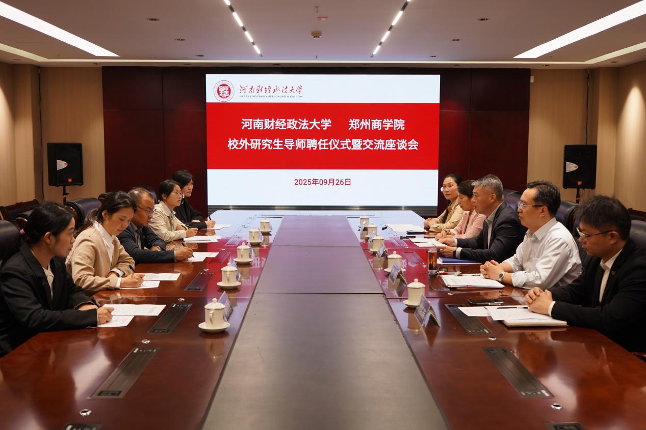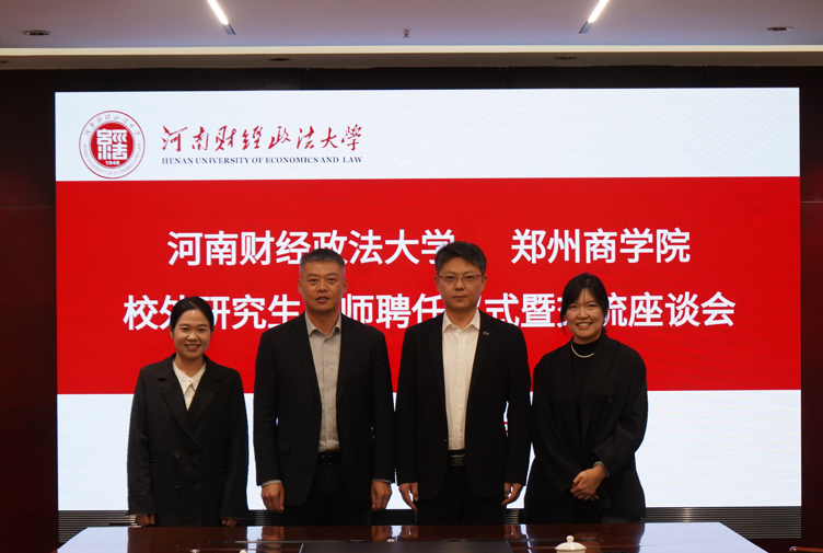 9月26日15时,在河南财经政法大学行政楼,我校与河南财经政法大学研究生联合培养项目举行了导师聘任仪式。河南财经政法大学管理学部执行部长王永伟、合作发展部常务副部长研究生处副处长杨凯、研究生处副处长杨凯瑞、蔺全丽、管理学部副部长郑飞,我校教务处处长邱培磊,副处长周培娟,管理学院院长李晓翠及邓一平老师、黄信恒老师出席仪式。会议由河南财经政法大学管理学部副部长郑飞主持。