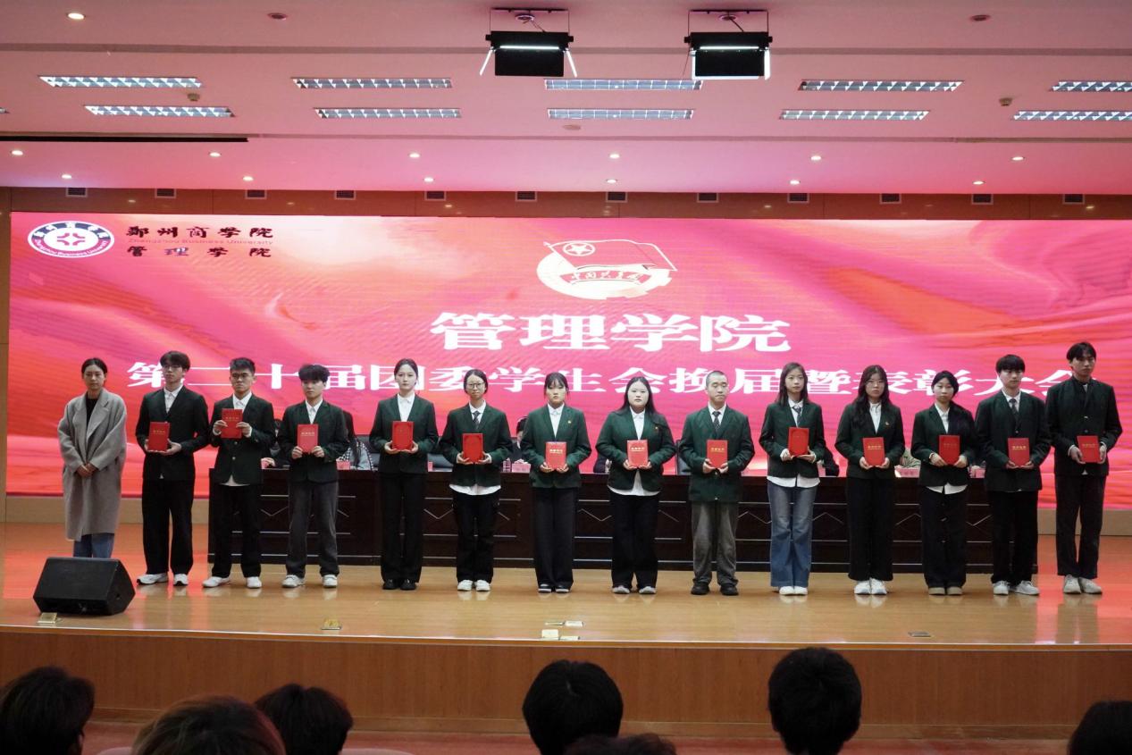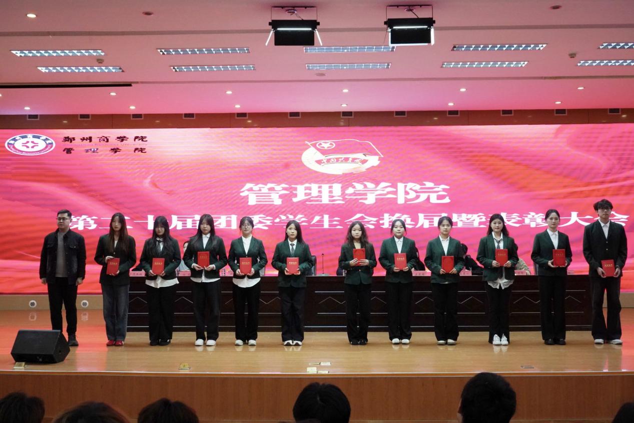 在表彰环节之后,迎来了备受瞩目的换届环节。团委书记朱赛楠宣读了《管理学院关于任命第二十届团委学生会主要干部的决定》,张勤英老师为第二十届团委学生会干部代表颁发聘书、宋森书记为第二十届团委学生会主席团颁发聘书。第二十届团委学生会主席团成员及各部门干部代表一一亮相,他们带着自信的笑容和对未来工作的热情,接过了前辈们手中的接力棒。