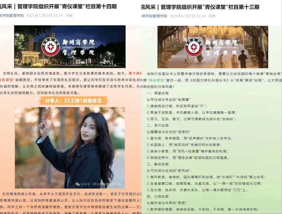 二是创新宣传载体,营造浸润式礼仪氛围。在巩固传统宣传阵地的基础上,学院积极拓展宣传渠道,通过"最美课堂"微摄影征集等活动,鼓励学生用镜头发现和记录课堂中的礼仪之美,展现整洁环境、师生互动、自觉自律等文明瞬间,在评选与展示中潜移默化地传递课堂礼仪规范。活动共征集作品多幅,评选出各级奖项,有效激发了学生参与文明建设的热情。同时,持续通过学院公众号开展"青仪课堂",分享学子在校期间礼仪教育所带来的实践体悟以及各种礼仪知识小贴士。