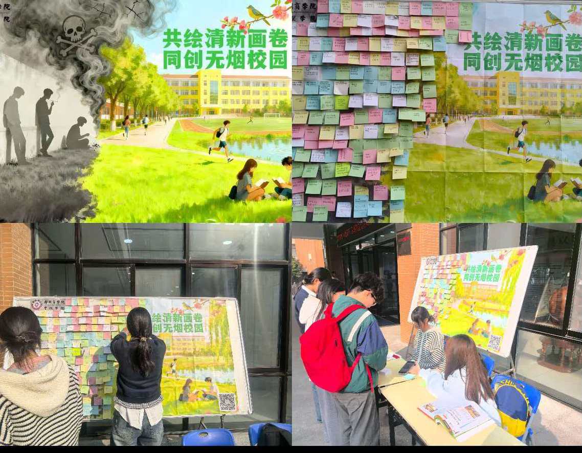 一是举办"共绘清新画卷,同创无烟校园"互动涂鸦墙活动,以"覆盖吸烟场景"的创意互动形式,引导学生直观认识烟草危害,自觉承诺拒绝烟草,活动现场互动热烈,同学们纷纷写下"远离烟草,青春无悔""无烟校园,你我同行"等真挚倡议,并将这些承载着心声的便利贴贴在左侧抽烟画面上。随着一张张便利贴的覆盖,灰色场景逐渐被隐去,展板最终呈现为一幅完整和谐的校园风光图,每一张便利贴,都成为大家守护无烟校园的实际行动。