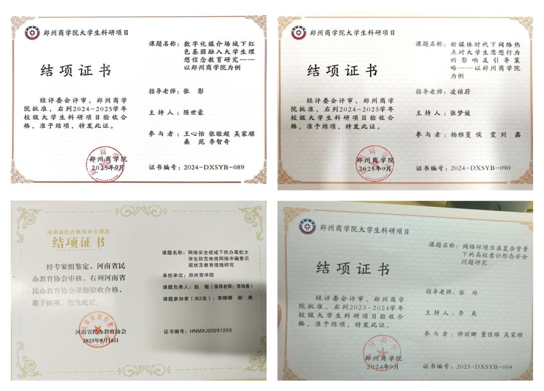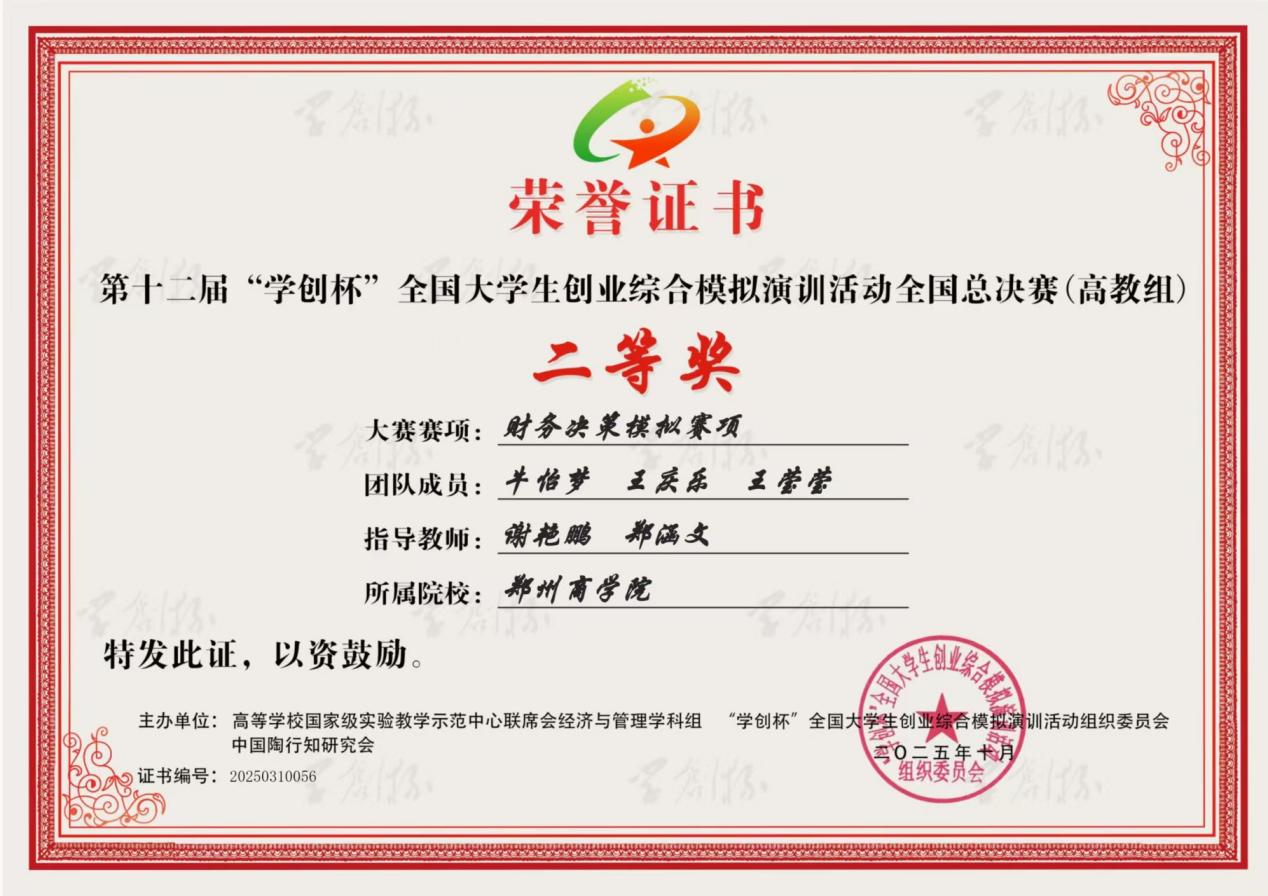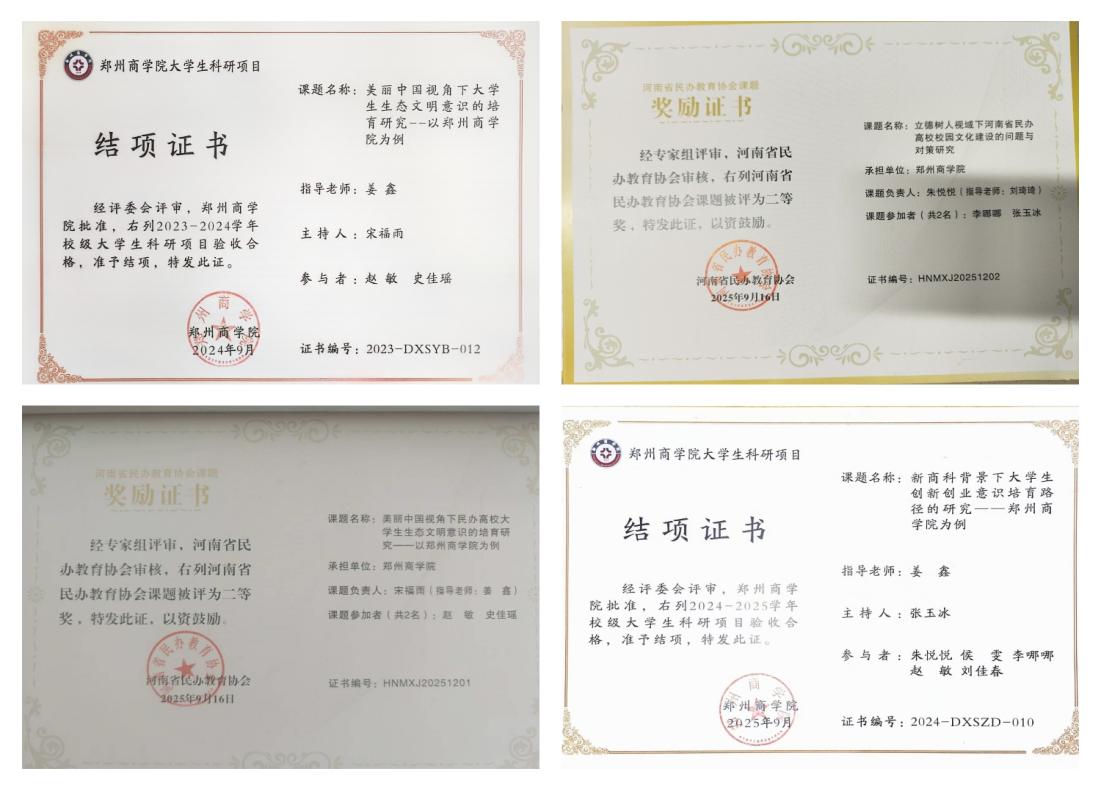 其中,宋福雨主持的河南省民办教育协会课题《美丽中国视角下民办高校大学生生态文明意识的培育研究——以郑州商学院为例》荣获二等奖,侯雯、杨雅蔓、张梦媛、牛怡梦等同学分别斩获2024年“科云杯” 全国大学生财会职业能力大赛河南赛区二等奖、2024年“网中网杯”大学生财务决策大赛省赛三等奖、2025年“科云杯”企业税务及经营管理技能大赛全国三等奖、2025年“衡信杯”全国个税精英挑战赛三等奖等多项荣誉,以赛促学、以赛提能,全面提升专业素养与实践能力。