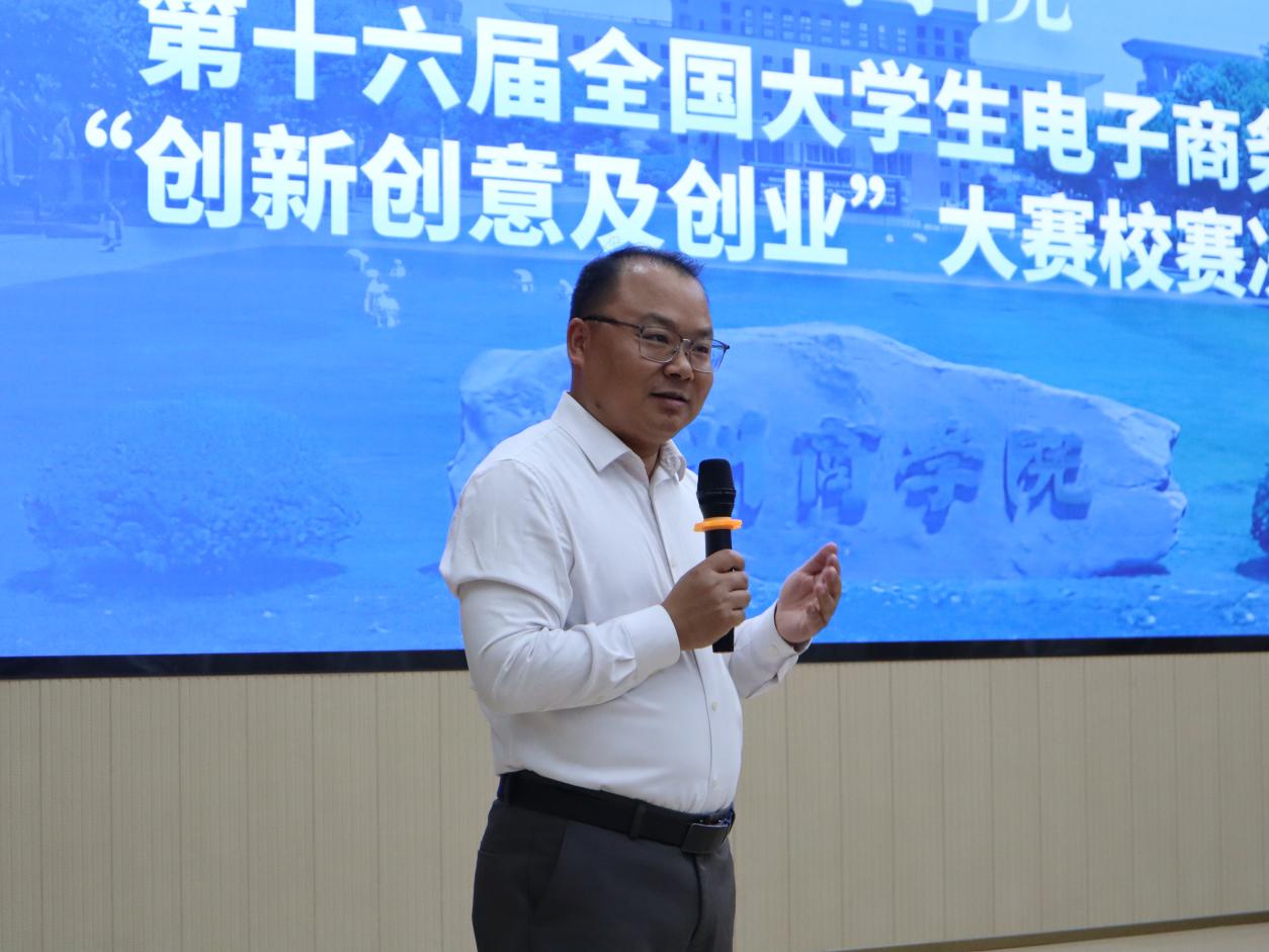 我校教务长邱培磊作动员讲话。教务长代表学校向大家的到来表示热烈的欢迎和衷心的感谢,并一一列举了我校近年来在全国大学生电子商务“创新、创意及创业”挑战赛取得的成绩,高度认可我校学子积极参与大学生创新项目的热情与勇气。他讲到,本次大赛是展示创新思维、实践能力和团队协作精神的重要平台,同学们的参赛项目涵盖了电子商务的各领域,每一个都是立足解决实际问题的新思路新方案,都有可能成为助推行业发展的新动力,希望同学们珍惜平台,充分展示。同时也积极学习他人的优点和经验,不断提升自己的创新思维和实践能力,将创新成果转化为实际生产力,为社会发展贡献力量。