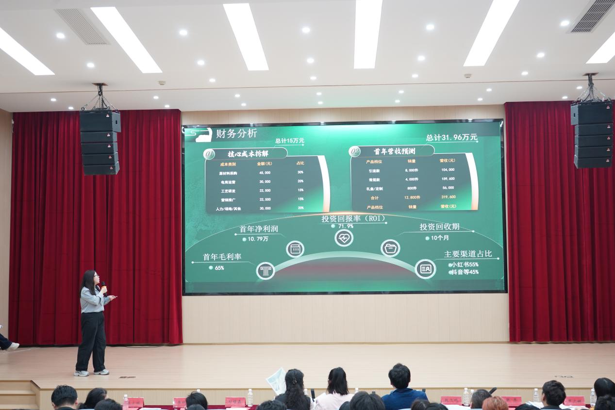 决赛现场,各参赛团队聚焦非遗传承、乡村振兴、校园服务等多个社会热点,围绕项目创新点、商务策划与可行性分析、创业实践及经营效果等内容展开精彩演讲,充分展现了我校学子的电商创新思维与创业实践风采。评委提问环节中,评委们以专业的职业素养与深厚的理论知识为基石,从项目的创新性、可行性、市场前景等多个维度进行了专业点评,并提出了宝贵的建议。