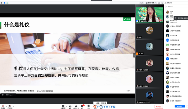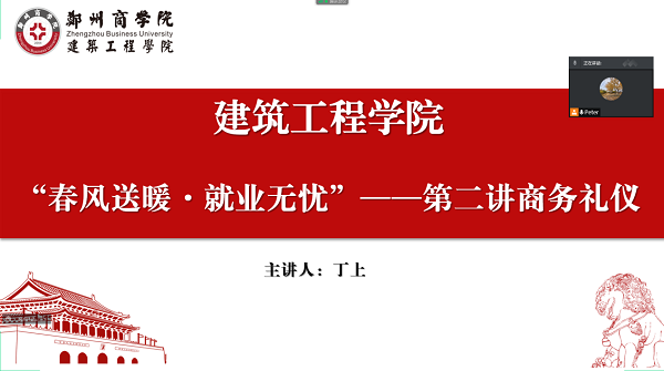 我院于2022年4月14日晚18:00通过钉钉会议邀请了上海链家校园品牌部招聘主管丁上老师为同学们做商务礼仪的培训。
