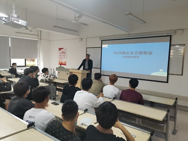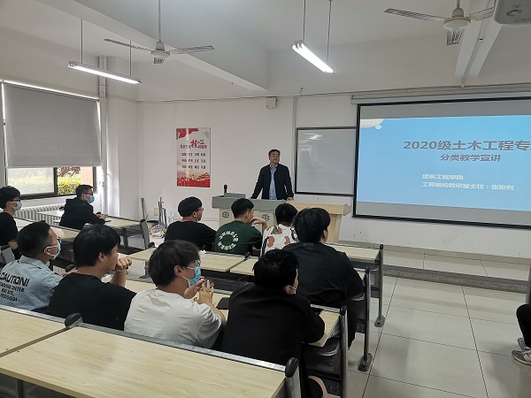 为促进我院分类教学工作顺利发展,帮助学生合理规划未来生涯发展方向,提高学生创新精神、实践能力和职业修养。5月15日,建筑工程学院在亚泽大楼104教室召开2020级土木工程专业分类教学宣讲会,结构教研室主任张盼利副教授、院长孙利民教授、范睿博老师、孙婷婷老师和辅导员吴森老师参加会议。会议由吴森老师主持,张盼利老师对分类教学进行讲解,孙院长对会议进行总结,范睿博老师和孙婷婷老师对学生关于考研存在疑虑进行答疑。