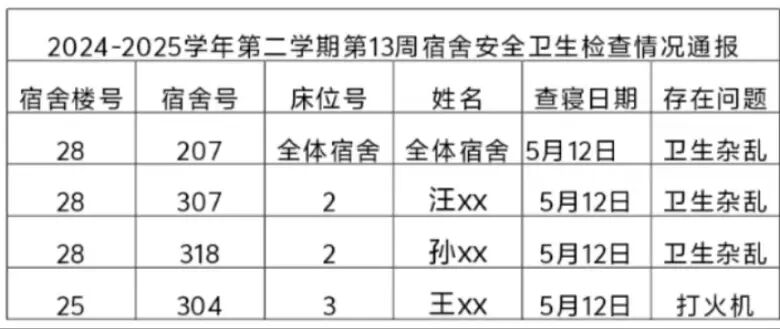为督促同学们养成良好的安全和卫生习惯,激发广大学生的共建热情,改变我院学生宿舍安全和卫生状况,给同学们创造一个干净、舒适、整洁、卫生、文明的住宿环境。现将第13周宿舍检查情况通报如下: