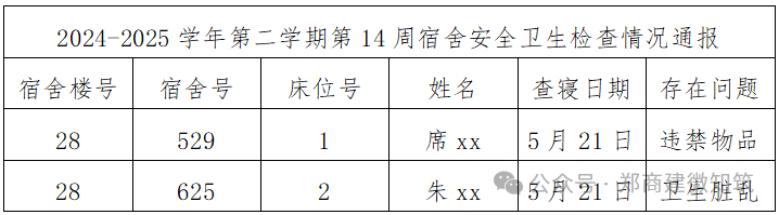 为督促同学们养成良好的安全和卫生习惯,激发广大学生的共建热情,改变我院学生宿舍安全和卫生状况,给同学们创造一个干净、舒适、整洁、卫生、文明的住宿环境。现将第14周宿舍检查情况通报如下: