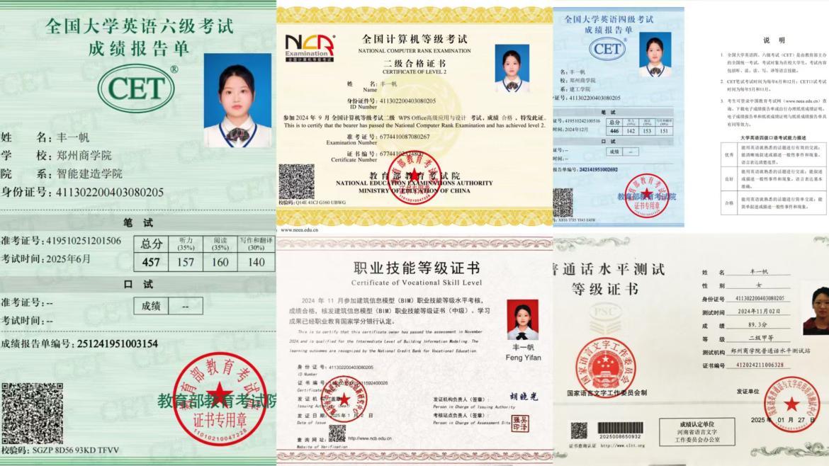 学院也始终积极鼓励并全力支持我们考取专业证书,并提供系统的学习资源和指导。我也深刻认识到,在工程造价这个深度与广度并重的领域,单一的课堂知识远不足以构筑坚实的职业根基。为了有充足的技能满足日后工作的需求,我努力通过了全国大学生英语四级、六级、计算机二级考试,并取得普通话二级甲等证书。同时考取BIM职业技能等级证书等,这些证书共同构成了我专业能力的“资质版图”,它们不仅是求职时的“专业通行证”,更是我未来在更广阔平台上参与项目竞争的坚实根基。