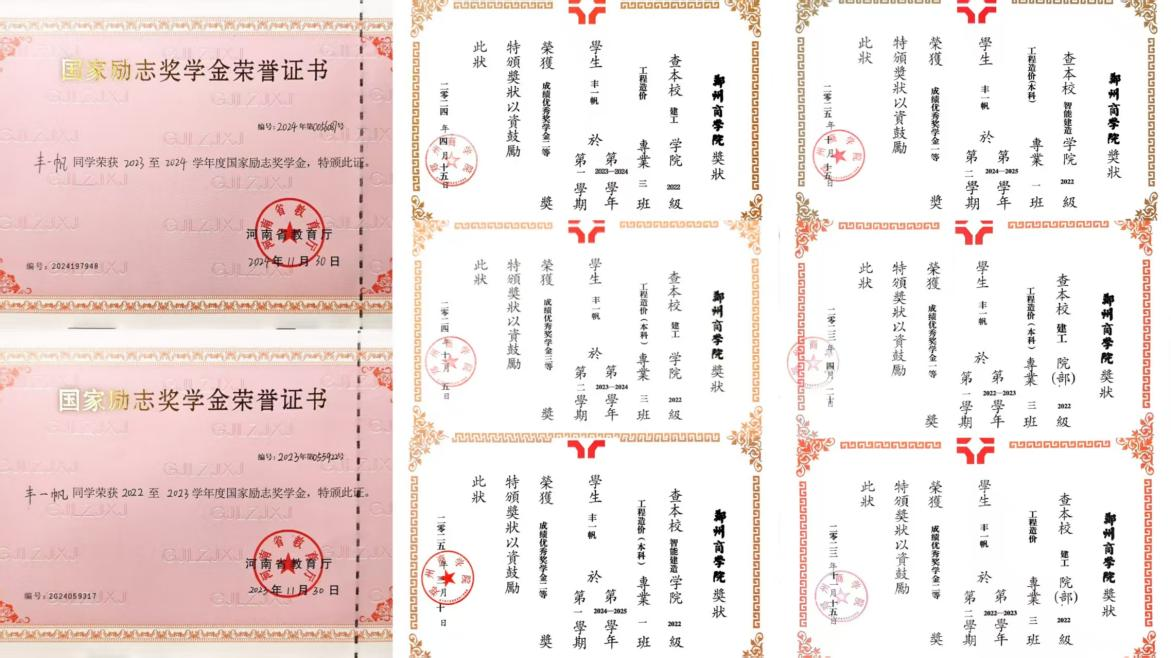 丰一帆,女,中共党员,郑州商学院智能建造学院工程造价专业22造价1班团支书。荣获三次国家励志奖学金、六次成绩优秀奖学金及河南省三好学生。参与多项学科竞赛,并获得“建美中原”河南省大学生建筑设计大赛一等奖、全国大学生电子商务“创新、创业及创意”挑战赛一等奖、“互联网+”大学生创新创业二等奖等。