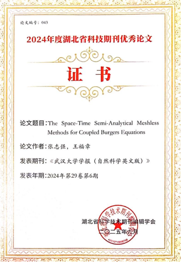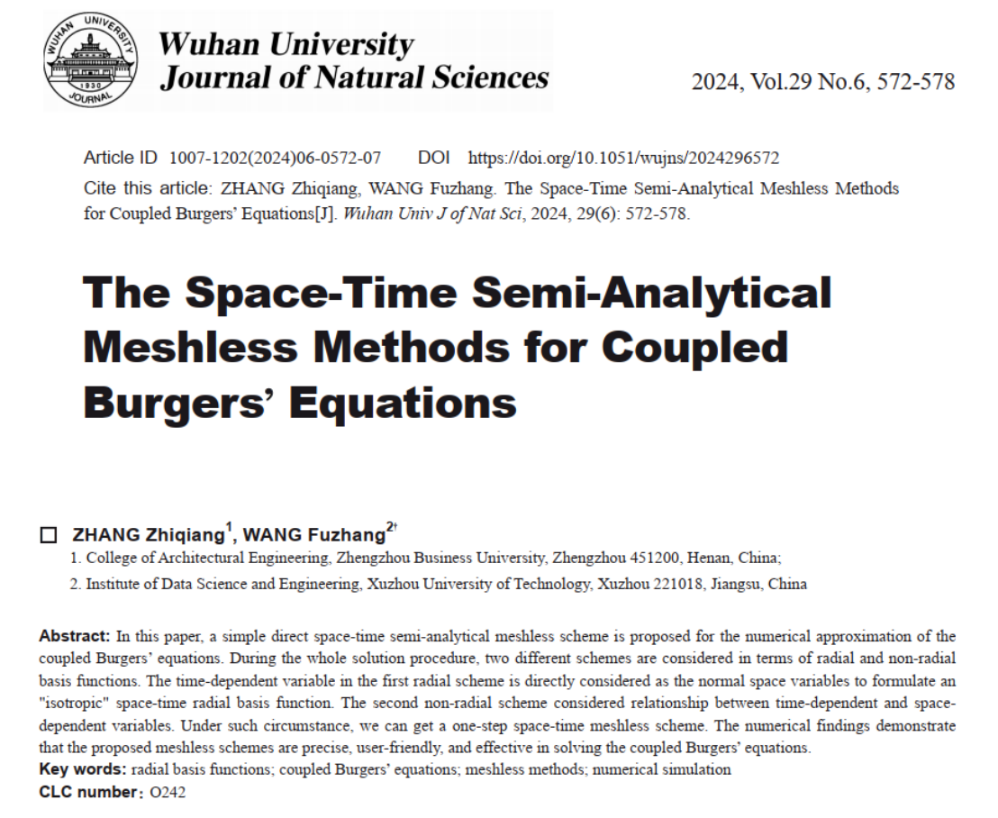 张志强老师与合作者在武汉大学学报自然科学英文版上发表了题为《The Space-Time Semi-Analytical Meshless Methods for Coupled Burgers' Equations》的文章中,提出了一种简单的半解析直接时空无网格格式用于耦合Burgers方程的数值近似求解方法。在求解过程中,考虑了径向基函数和非径向基函数两种不同的方案。数值结果表明,所提出的无网格方法精度良好、使用友好,并能有效地求解耦合的Burgers方程。文章链接为:https://doi.org/10.1051/wujns/2024296572。