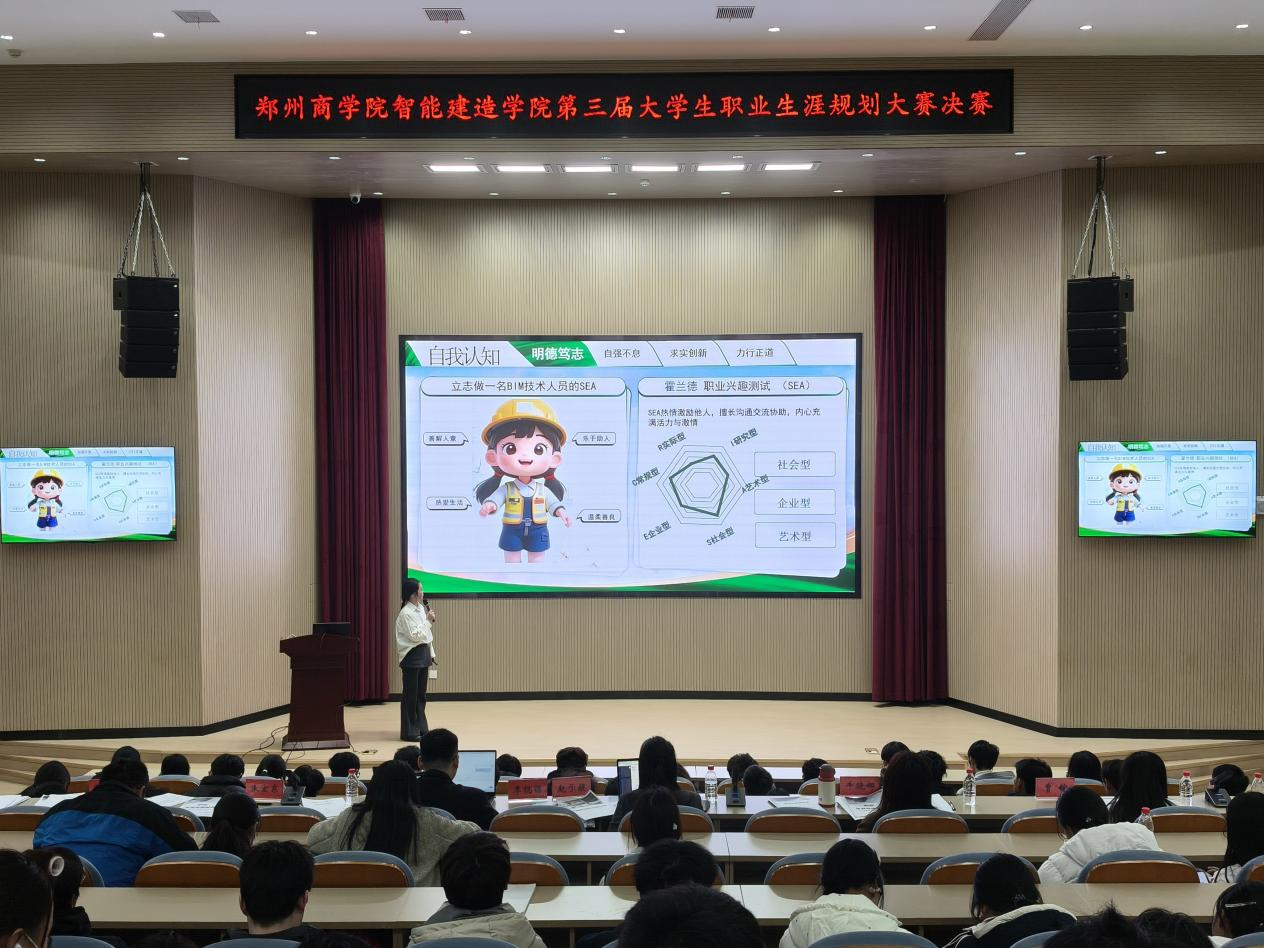 决赛现场气氛热烈而有序。选手们通过PPT展示、现场陈述的形式,依次进行精彩展演,他们结合SWOT分析和MBTI人格测试从自我认知、专业优势出发,结合行业调研数据,清晰阐述了结构工程师、BIM技术负责人、智慧工地项目经理、装配式建筑设计师等多元职业目标,详细拆解了长短期发展计划与实施路径,围绕相关行业趋势结合“专业+数字化”的复合型能力提升方案,展现了对智能建造技术、绿色建筑理念等能力的规划思考。