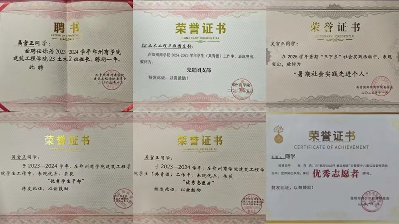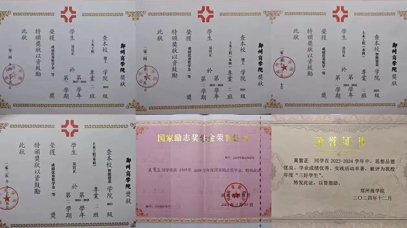 吴官正,男,中共预备党员,郑州商学院智能建造学院土木工程专业23土木2班班长、资助助理团团长,曾任校讲解团办公室负责人。学年成绩和综测成绩均稳居专业第一,共获四次成绩优秀一等奖学金;荣获国家励志奖学金两次、三好学生、优秀学生干部等荣誉50余项。在学术竞赛、科研创新、志愿服务、社会实践等方面表现突出,展现出全面发展的优秀素养。
