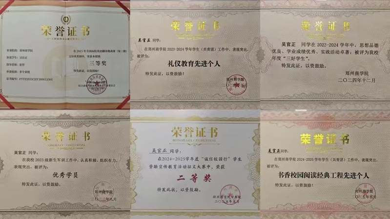 他注重综合素质的提升,荣获“礼仪教育先进个人”“书香校园阅读经典工程先进个人”等多项荣誉称号。在征文比赛、英语词汇竞赛、组织管理能力大赛等活动中也屡有斩获,展现出广泛的知识面与扎实的综合能力。他热爱阅读、善于表达,在文字中构建精神家园,在活动中锻炼领导力,逐渐成长为一名有理想、有本领、有担当的新时代青年。