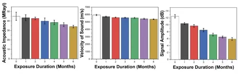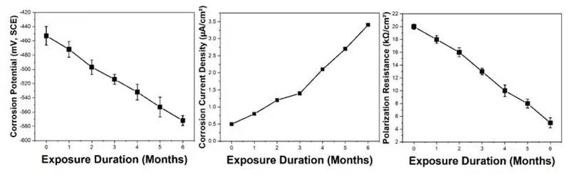 最关键的发现终于浮出水面。研究表明,钢-水泥界面区才是整个结构的“阿喀琉斯之踵”。超声波检测显示界面声阻抗值从45.0M-Rayl降至34.0M-Rayl,结合质量显著下降。SEM图像中可见明显的界面缝隙。更令人警觉的是,界面处钢材的电化学活性远超本体:腐蚀电流密度高达3.4μA/cm2,腐蚀电位负移至-572mV,证明这里已成为腐蚀的“优先通道”。微区拉曼光谱在界面处检测到方解石与菱铁矿的富集,揭示了该区域复杂的物质迁移与反应机制。
