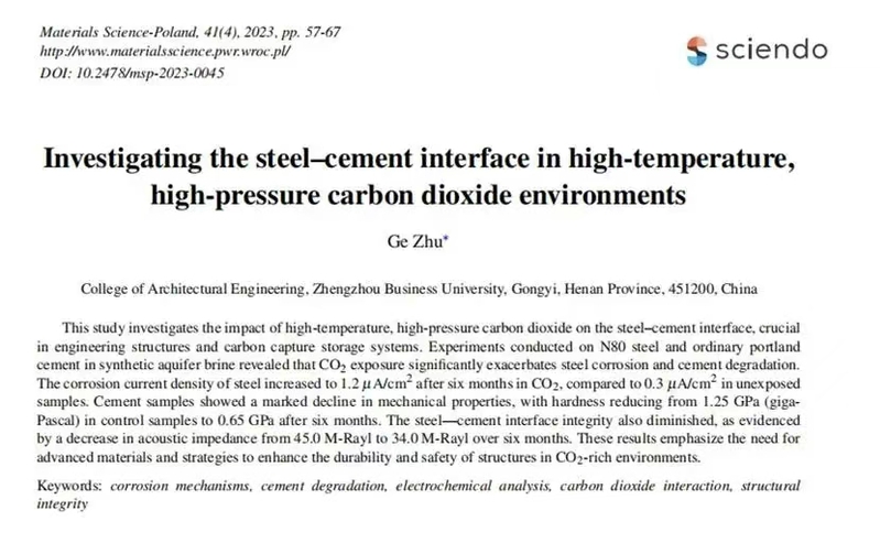 在全球气候变化治理背景下,碳捕集、利用与封存技术是实现碳中和的关键路径之一,但其核心结构——钢-水泥界面在高温高压CO2环境中的长期稳定性面临严峻挑战。该界面的失效可能导致封存气体泄漏,加速全球气候变暖,引发更频繁的极端天气事件;若泄漏至地下水层,将导致水体酸化,污染饮用水源,危及农业生产和粮食安全;局部高浓度CO2聚集还可能造成人员窒息等直接生命危险,严重抵消碳封存应有的生态效益。近期智能建造学院朱歌教师所在团队设计了一套高度仿真的实验系统,选用常用于油井套管的N80钢材与普通波特兰水泥,在模拟地层盐水中,将其置于10MPa、50℃的高温高压CO2环境中,通过采用防护涂层、腐蚀抑制剂,以及掺入粉煤灰等辅助材料改性水泥基体,可有效延缓材料劣化进程,从而保障碳封存设施长期安全运行,为人类构建可靠的气候治理工程技术屏障。该研究成果于2024年4月发表于《Materials Science-Poland》,引发建筑行业广泛关注。文章具体链接为:https://sciendo.com/article/10.2478/msp-2023-0045
