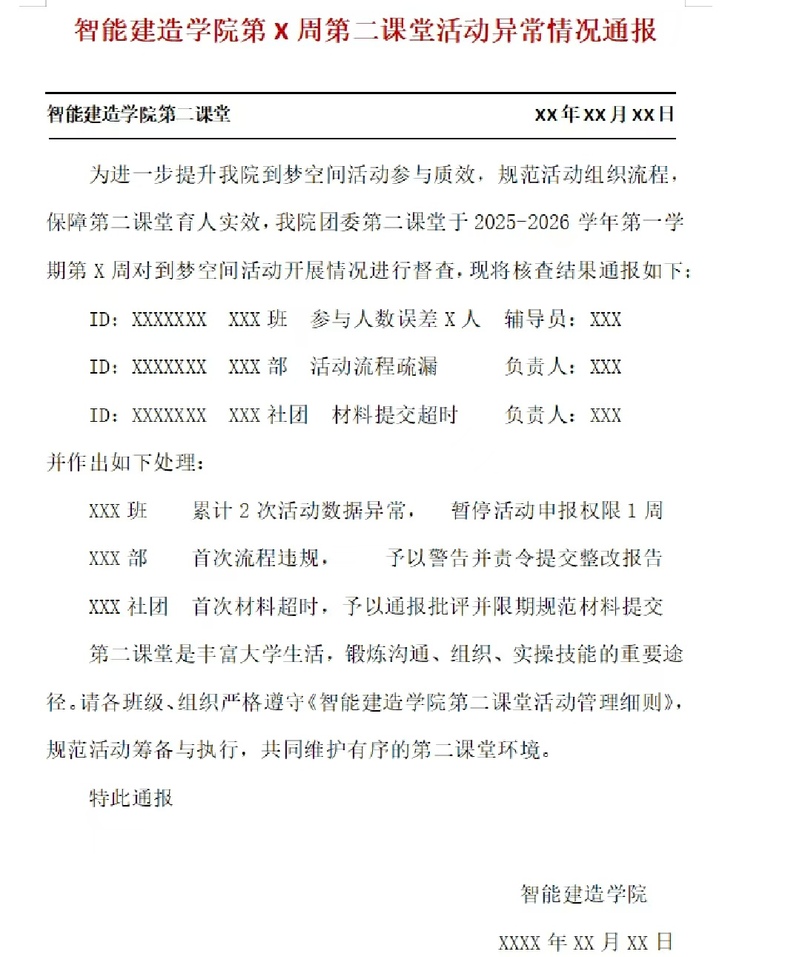为进一步完善我院第二课堂育人体系,落实立德树人根本任务,提高我院同学们对到梦空间活动的参与度,现针对近期活动开展过程中出现的不规范现象进行整改,制定《智能建造学院第二课堂活动申请规范》。