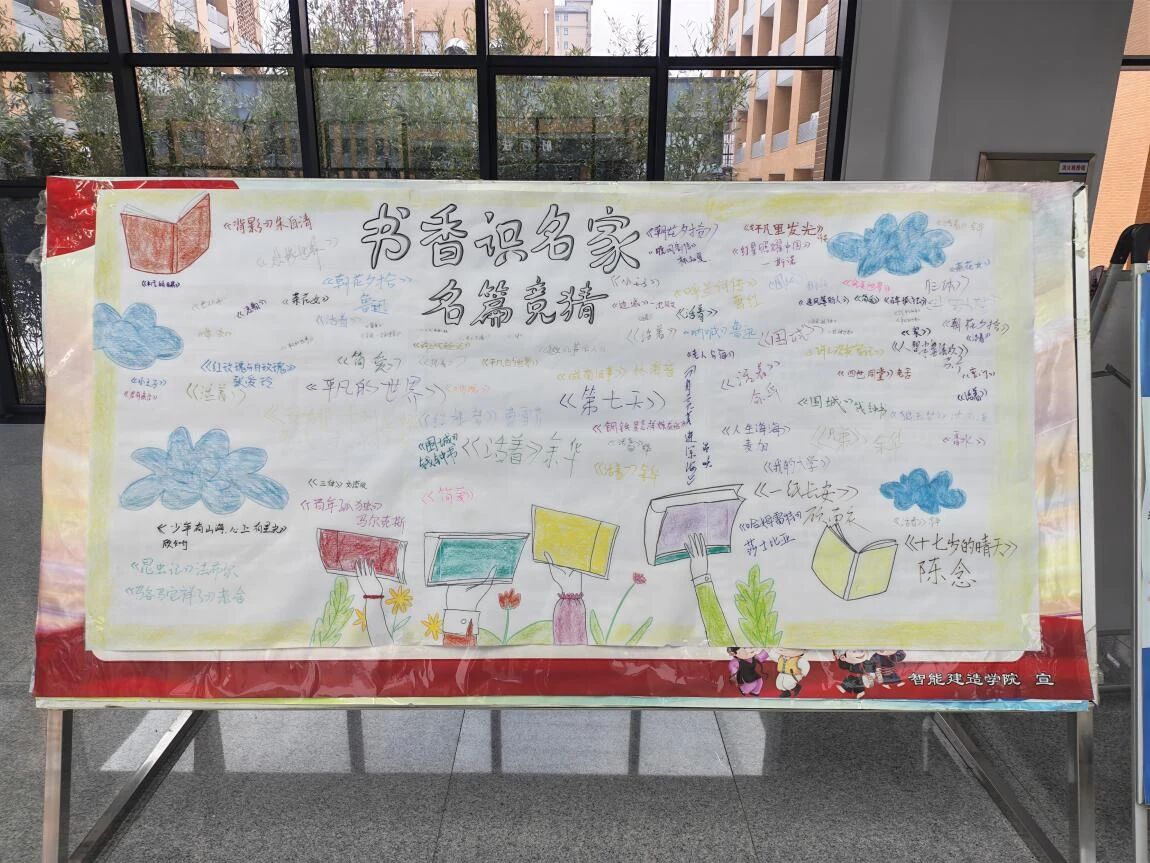 智能建造学院于3月26日在敏行楼大厅开展了“书香识名家名篇竞猜”活动。本次活动以畅游书海、竞识经典为主题,同学们在知识文化墙上写下经典书籍名称及其作家,工整隽秀的笔迹铺满文化墙,汇成了一道浓郁雅致的书香景观。文化墙上的字句错落排布,墨韵文气交织出一幅厚重的经典文化长卷。此次活动让同学们在竞答中感悟文字魅力,在书香中传承经典文脉。