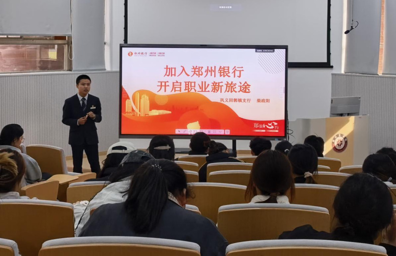 首先,徐老师代表金贸学院对郑州银行巩义支行社区市场主管柴政阳的到来表示热烈欢迎,同时表示希望能够在校企之间建立合作桥梁,共同推动学生培养;随后,柴主管围绕贷款产品政策、个人成长经历、银行平台优势、征信保护知识等方面展开讲解。通过对“郑e贷”、“郑惠贷”等特色产品的解析,帮助学生理解信贷政策与实际应用,并且结合自身从毕业生快速晋升为社区主管的成长路径,介绍郑州银行清晰的职业发展通道和薪酬福利优势。同时以“珍爱个人征信”为主题,强调信用意识在金融生活中的重要性;最后,在互动环节,同学们围绕岗位选择、备考经验、工作内容等踊跃提问,柴主管结合实际情况一一作答,现场气氛活跃。