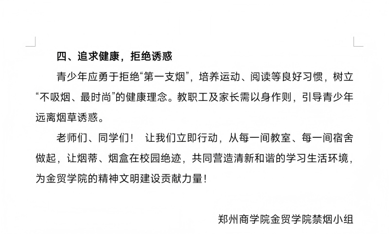 三是凝聚协同合力,将禁烟工作与宿舍管理、学生评优等环节挂钩,推动形成“全员参与、齐抓共管”的工作格局。