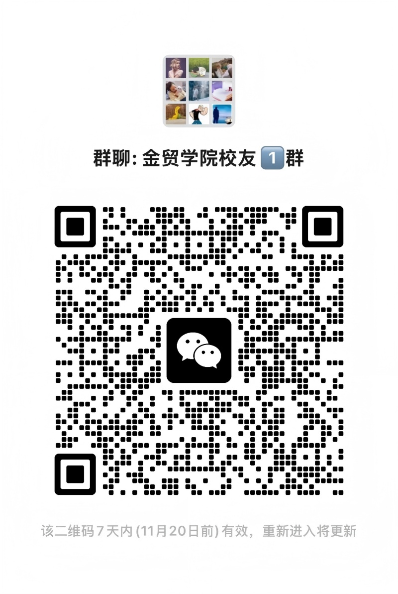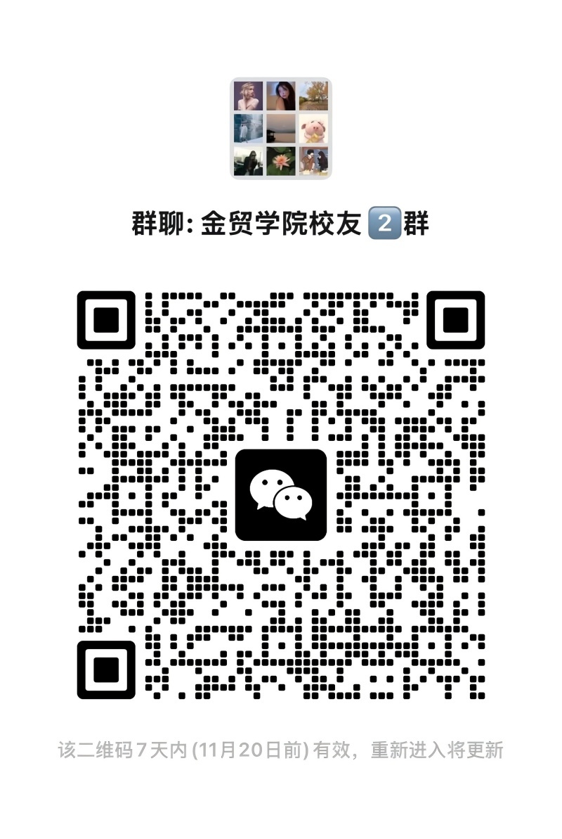 请金融与贸易学院校友扫描下方二维码进群。(温馨提醒:金贸学院校友群设有一群和二群,两群均为官方交流群,两群同步运营、福利共享,优先加入一群,群满可加入二群。)