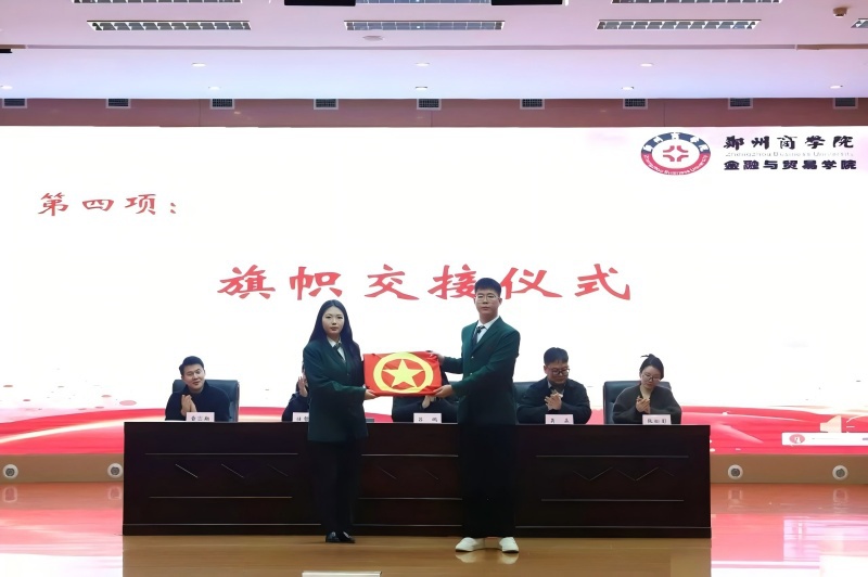 在旗帜交接仪式环节,象征责任与传承的团学旗帜完成传递,标志着第二十一届团委学生会正式接过工作接力棒。