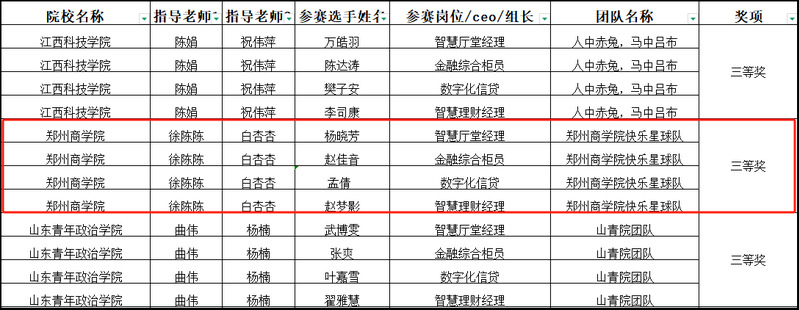 为积极响应国家金融发展战略,进一步深化产教融合,培养紧贴金融行业前沿需求的高素质应用型人才,11月8日,由全国数字经济智慧现代服务行业产教融合共同体指导,典阅教育研究院主办,深圳典阅科技有限公司承办的第十届全国大学生金融创新大赛在线上举行,我院24金融科技秦康、24投资霍嘉良、周强同学组成的“干就完事儿队”荣获互联网金融赛项团体二等奖,23投资杨晓芳、赵佳音、孟倩、赵梦影组成的“郑州商学院快乐星球队”荣获智慧金融赛项团体三等奖的佳绩。
