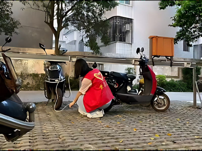 指尖捏着那根垂落的电线,把它一点点归拢到充电桩旁,风卷着树叶沙沙响,像在轻声应和。阳光从枝叶间漏下来,在我肩头洒下斑驳的光斑,电动车的金属外壳泛着暖光,连空气里都弥漫着草木与尘土的气息。