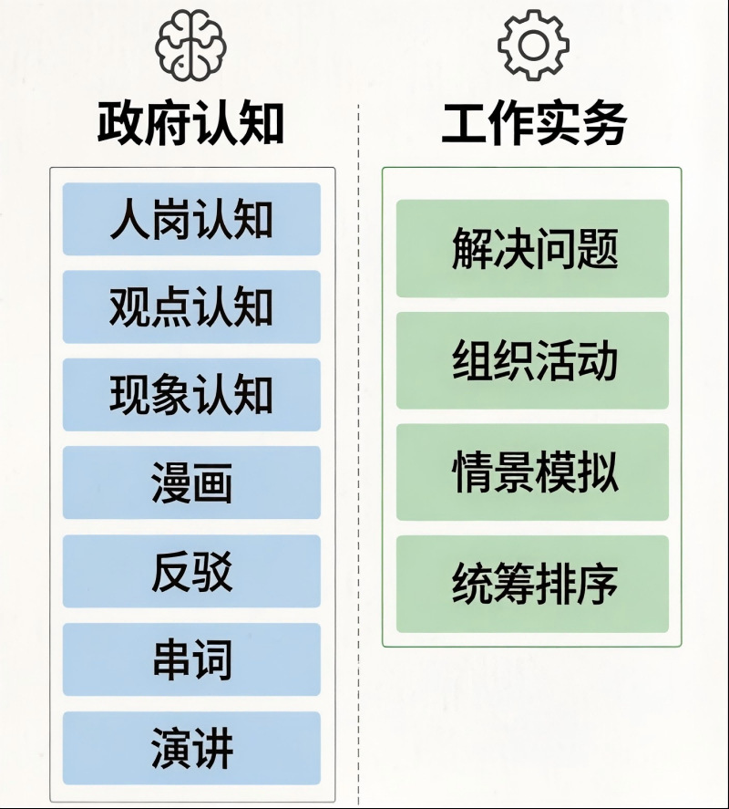 政府认知题:考查与岗位要求相匹配的认知能力,即考生能否以公务员身份、站在政府立场上,运用马克思主义唯物辩证法,对未来工作中可能面临的各种事物与现象进行理解和判断。主要包括人岗认知,观点认知、现象认知、漫画题、反驳题、串词题、演讲题等具体题型。