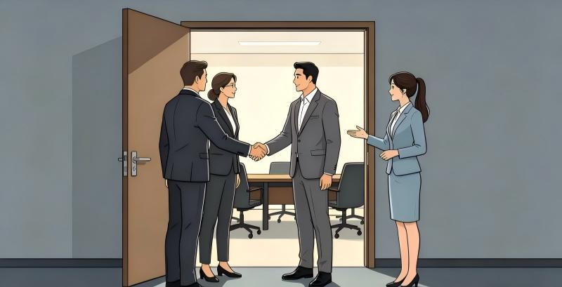 在会议室门口,小陈站在门边靠墙一侧,让出主通道。待双方走近,她正式介绍:“王总,这位是我们李经理。李经理,这位是XX公司王总及其助理。”介绍时,手掌指向被介绍人。李经理与王总主动握手,小陈退后一步,站立在门侧,确认双方落座、茶水备好后,轻声关门离开。