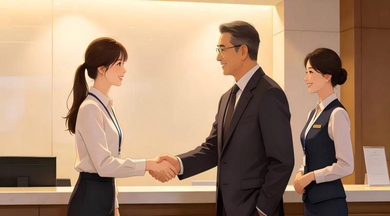 商务握手的黄金标准:主人先伸手、虎口对接、力度适中,全程目光注视对方,配合礼貌称呼;握手后也要向随行人员致意,同时欠身动作幅度不用过大。