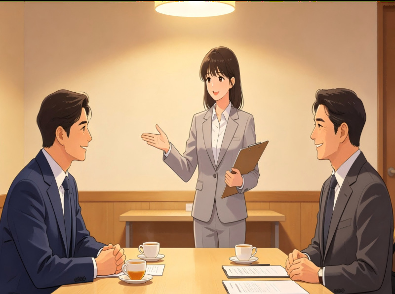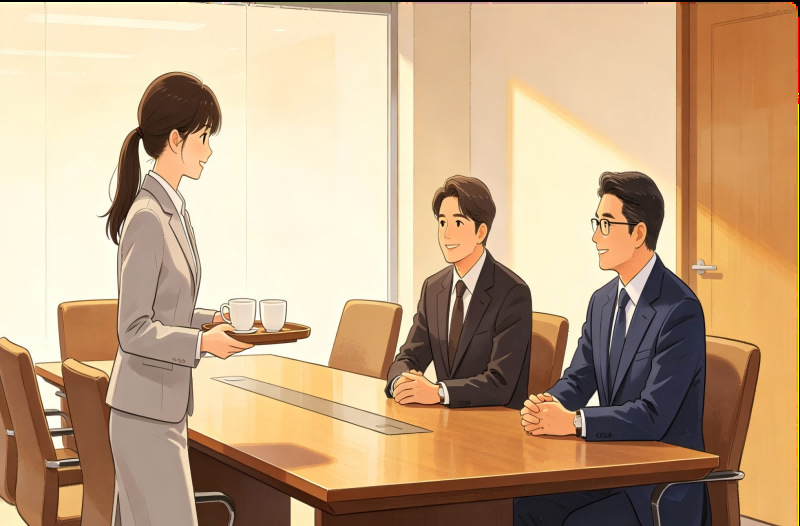 双方落座后,小陈依次为客户、己方领导奉茶,从座位右侧轻声上前,双手递上茶杯,杯柄朝向对方,奉茶后轻步退至一旁,不打扰双方交流。