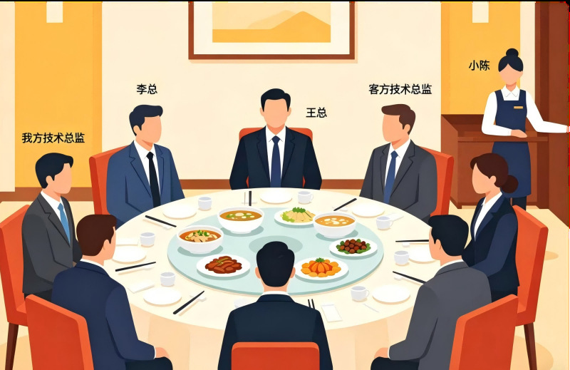 洽谈结束,小陈提前引导众人前往预定餐厅包间,按照“面门为尊、以右为上”原则,引导王总坐主位、李总坐主陪位,双方技术总监、助理依次落座,自己坐靠近门口的服务位。
