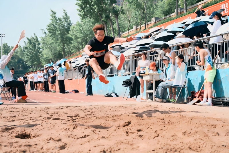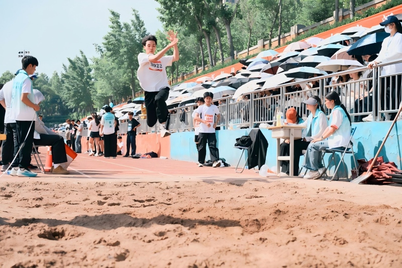 甲组田赛赛场同样竞争激烈,男子跳远决赛火热开启。选手助跑蓄力、腾空飞跃,动作行云流水,纵身一跃划出优美弧线,稳稳落地定格拼搏时刻。大家凭借扎实训练与过硬实力,不断突破自我,为学院添光增彩。