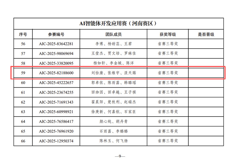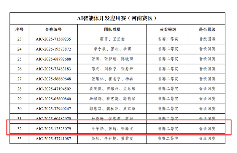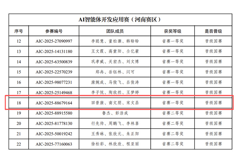 近日,第七届全球校园人工智能算法精英大赛产业命题赛道AI智能体开发应用赛(河南省赛)圆满落幕。我校大数据学院学生团队在本次比赛中表现优异,共获得省级一等奖1项、省级二等奖1项、省级三等奖1项及优秀奖1项,其中两支队伍成功入围国家级总决赛。