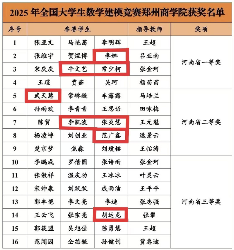 捷报传来,再谱新篇!近日,2025年全国大学生数学建模竞赛河南赛区获奖名单正式揭晓,我院学子凭借卓越的专业能力与团队协作精神,在这场全国性高水平赛事中大放异彩,一举斩获多项省级奖项,为学院赢得荣誉!